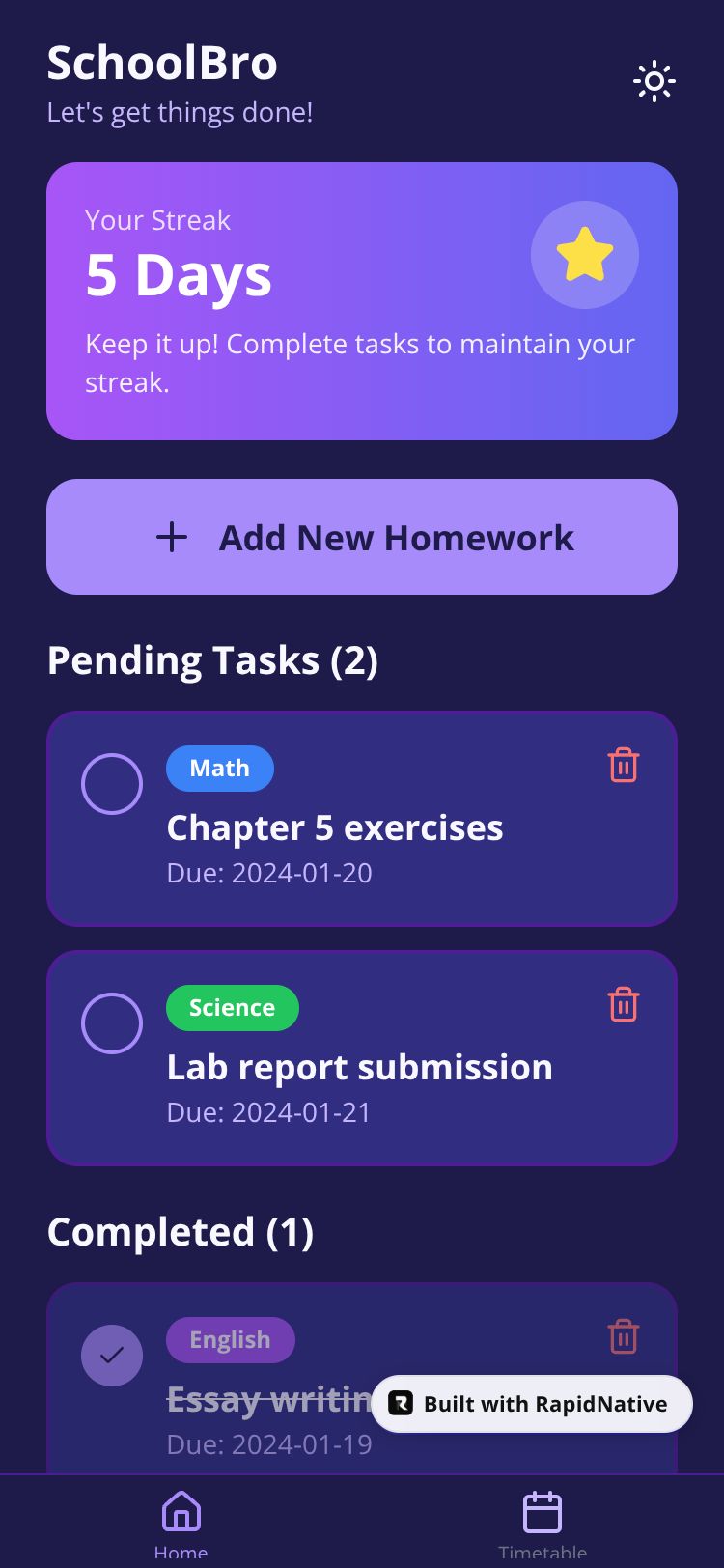 A fun and colorful school productivity app for students featuring homework tracking, timetable management, study timer, and notes.