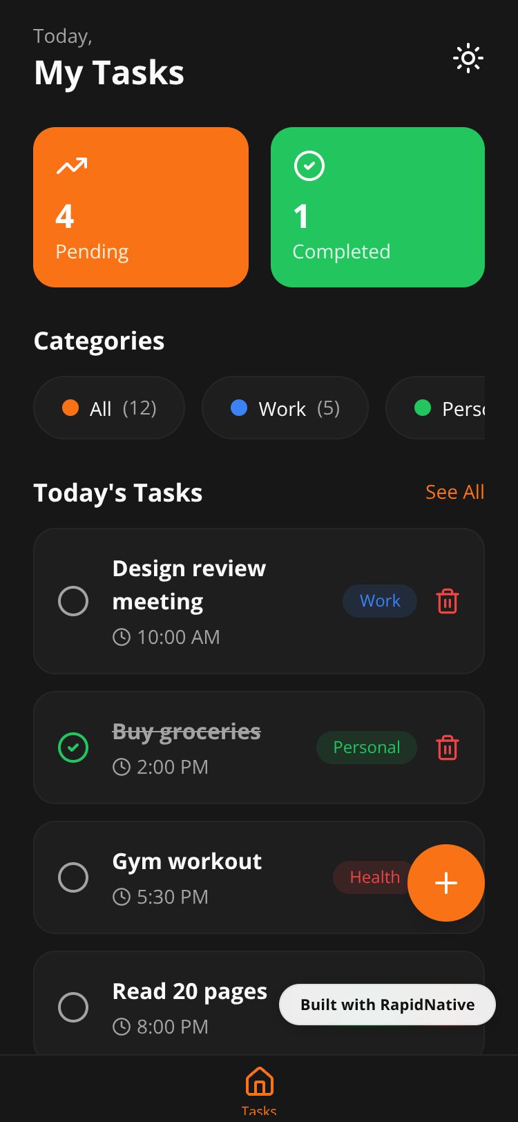 A modern task management app with orange and green accents. Organize your daily tasks, track progress, and boost productivity with a clean, intuitive interface.