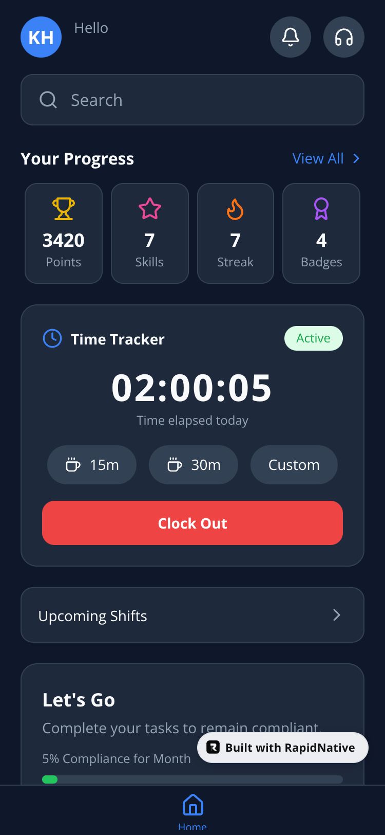 A comprehensive employee time tracking and workforce management app with clock-in/out, break tracking, compliance tasks, and progress monitoring.