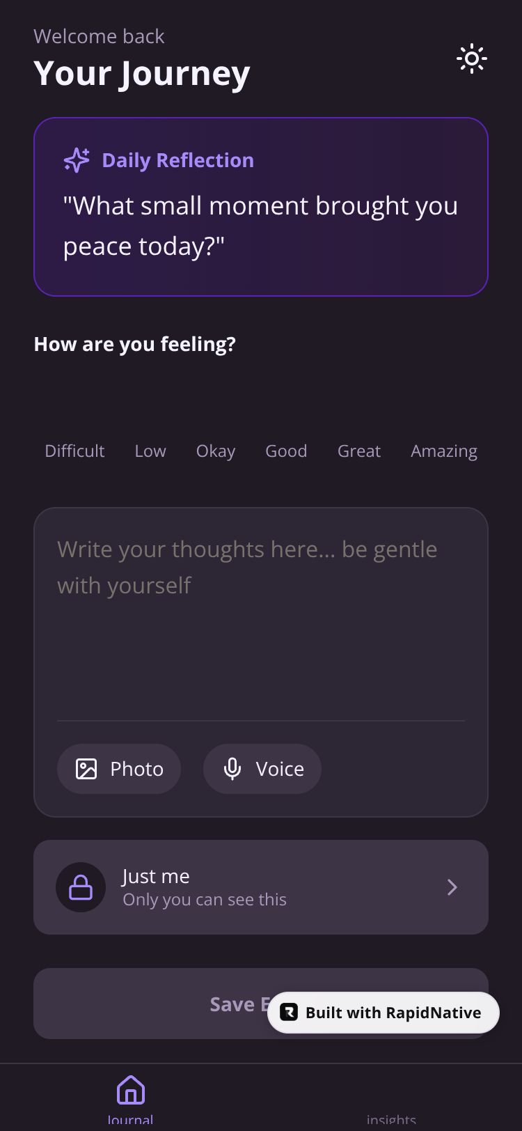 A private journaling app for mood tracking, daily reflections, and sharing with trusted friends. Track emotional trends and build supportive connections.