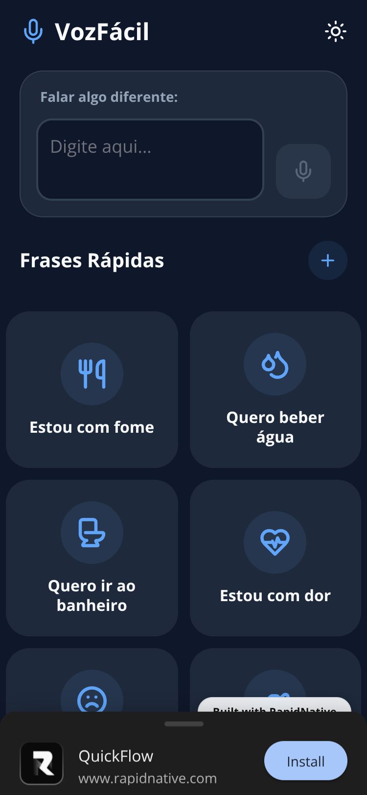 Aplicativo de comunicação assistiva para pessoas com TEA, permitindo falar através de botões de frases prontas e conversão de texto em voz.