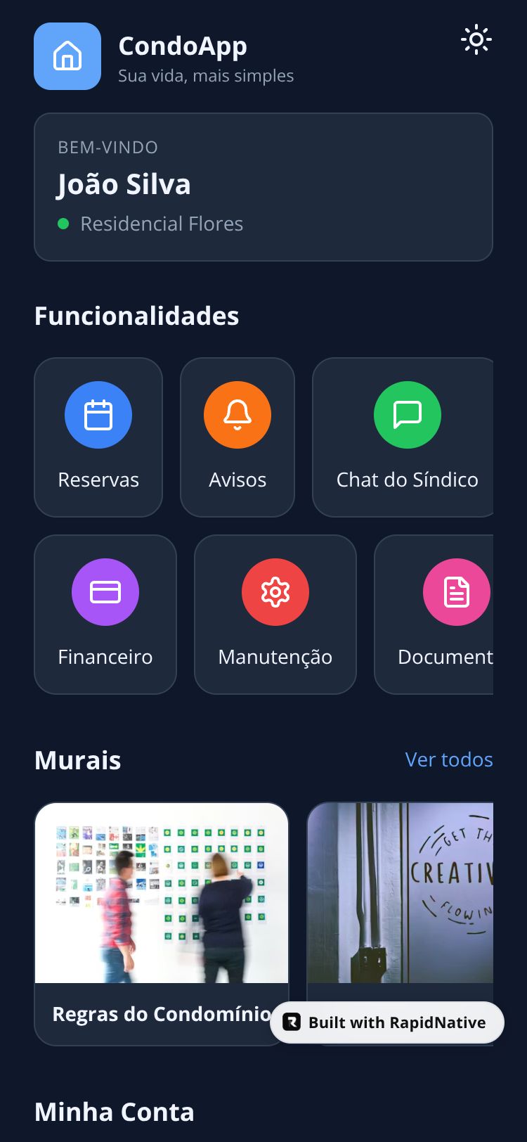 A modern residential condo management app with quick access to functionalities, community murals, and user profile actions.