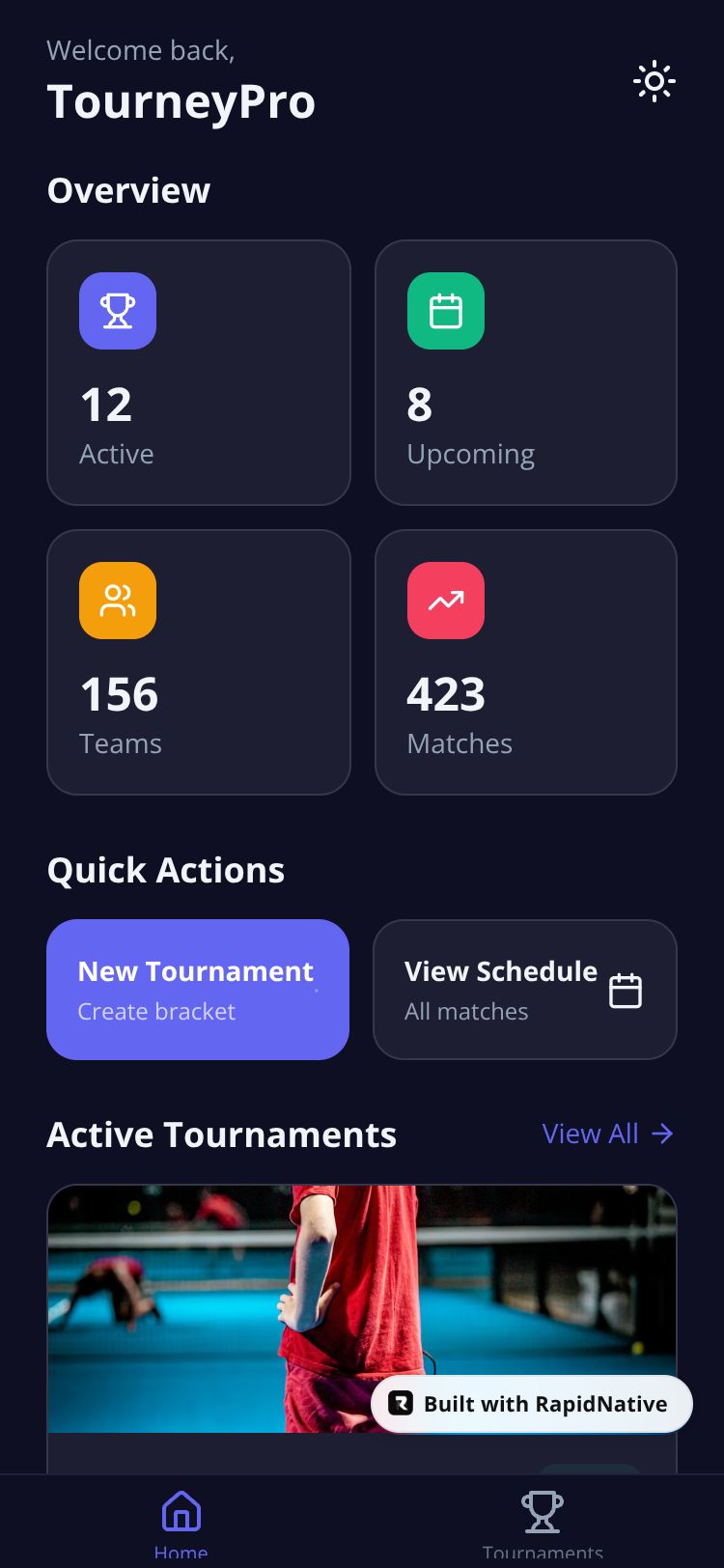 A comprehensive tournament management app for organizing and tracking sports competitions with brackets, scheduling, and team management.