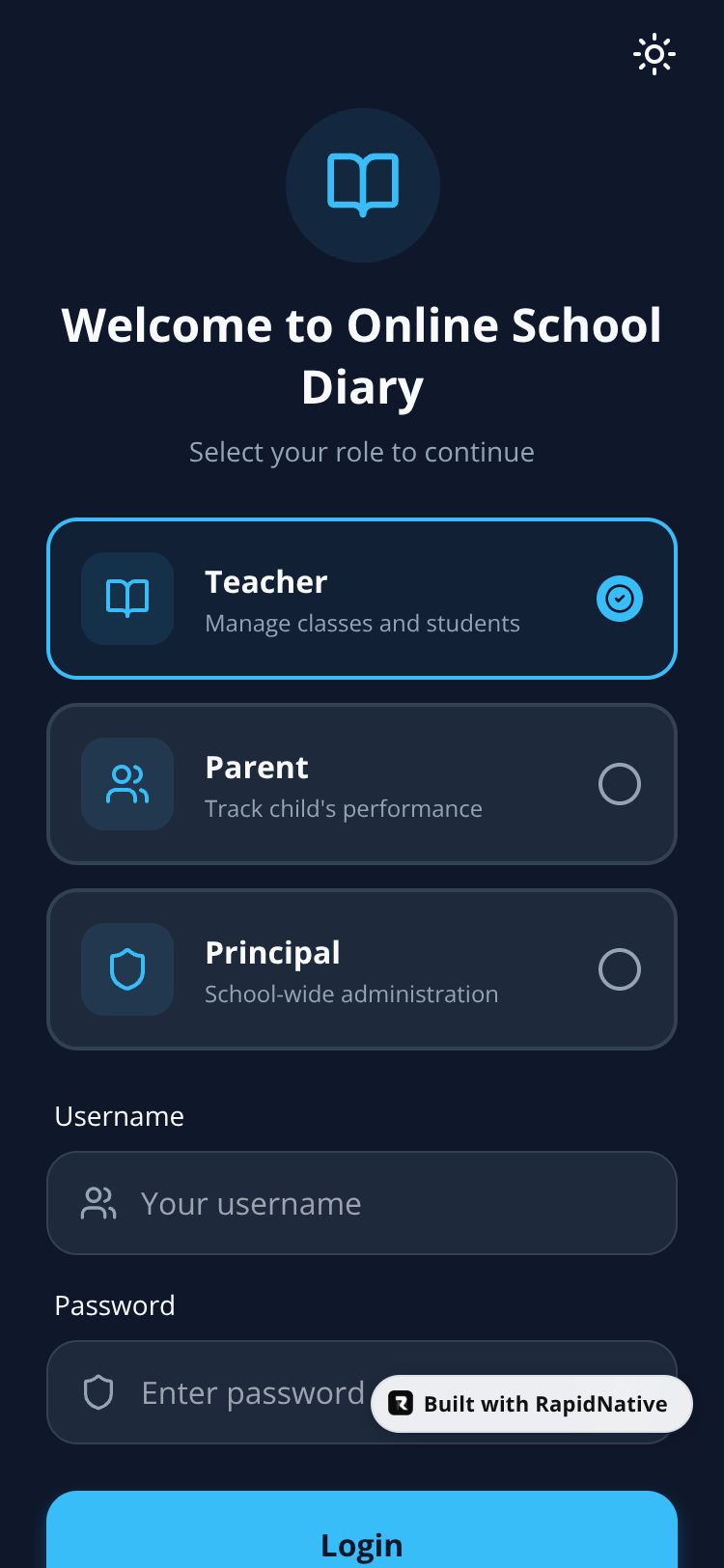 A school management app with role-based login for teachers, parents, and principals to track academic progress and manage classes.