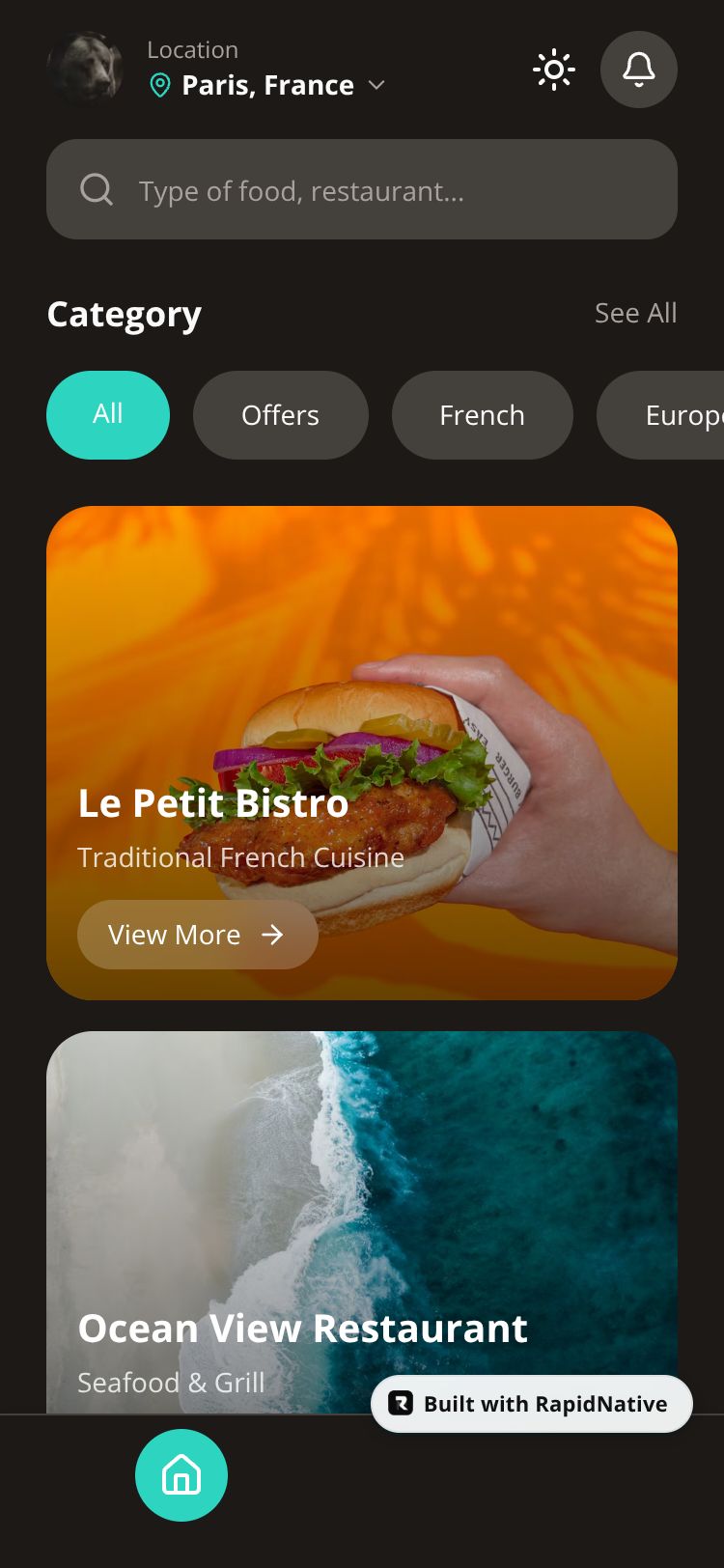 A modern restaurant discovery app with location-based search, category filtering, and community trends. Features elegant UI with teal accents and intuitive navigation.