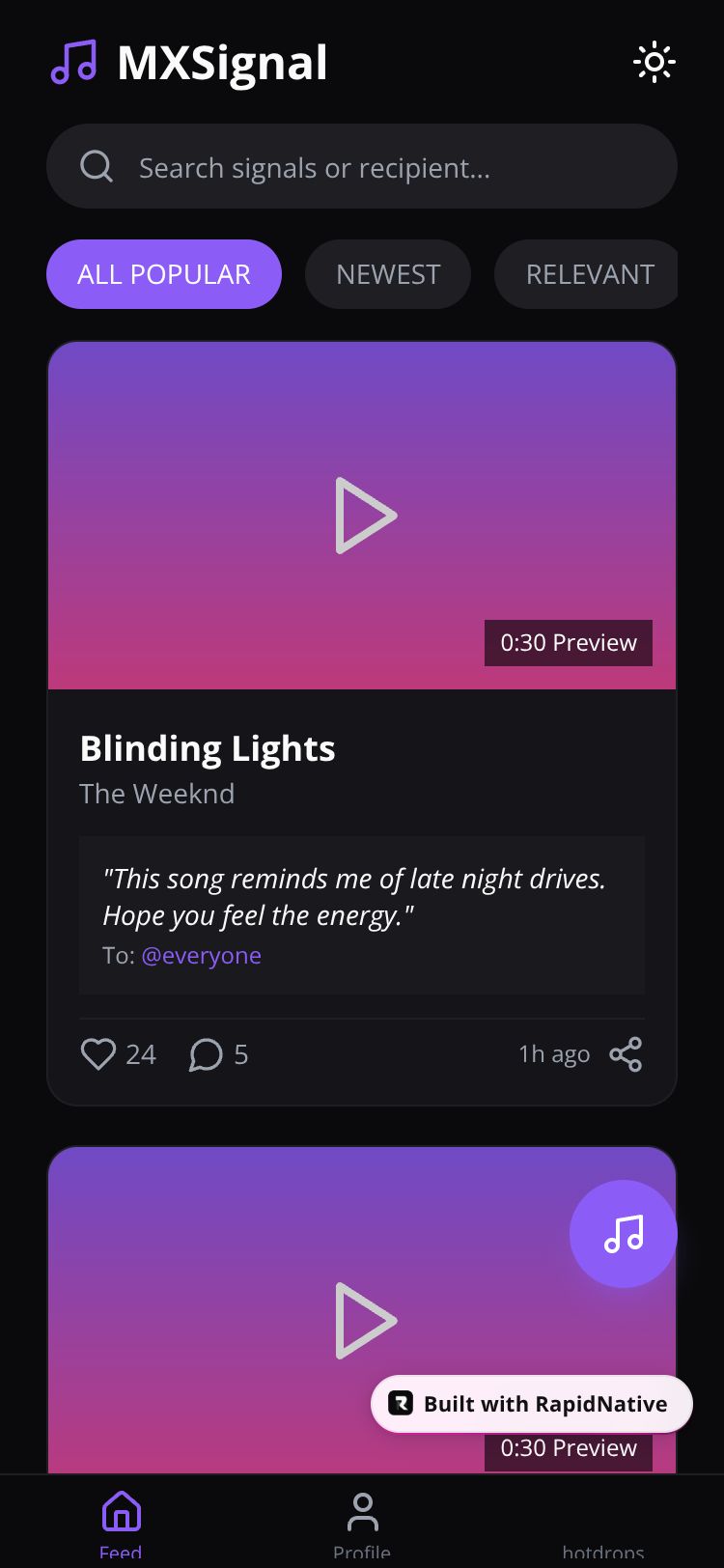 Share music anonymously through Signals. Dedicate songs, express feelings, and discover trending tracks without revealing your identity.