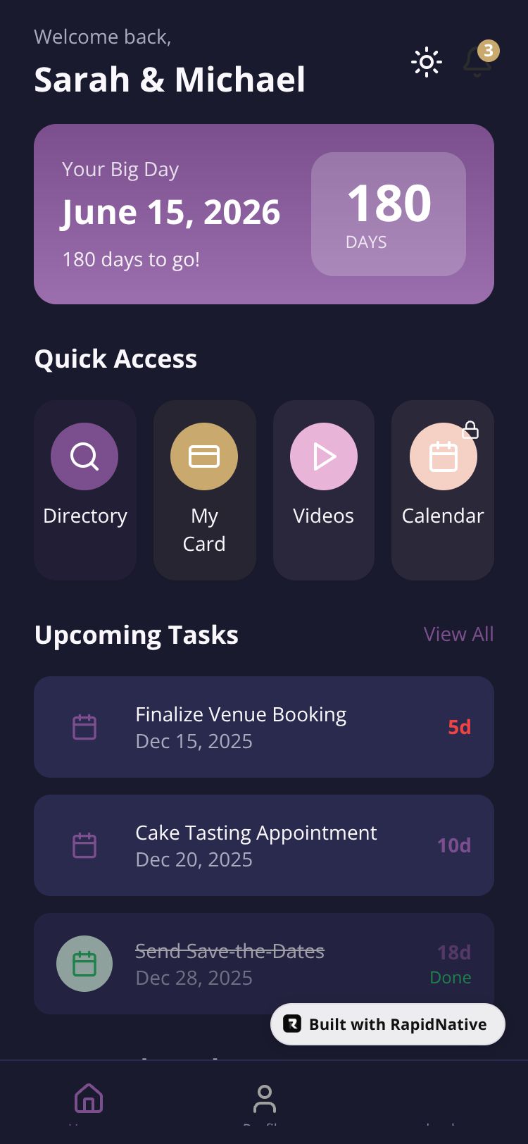 An elegant wedding planning app for engaged couples with vendor directory, digital membership card, and exclusive video content.