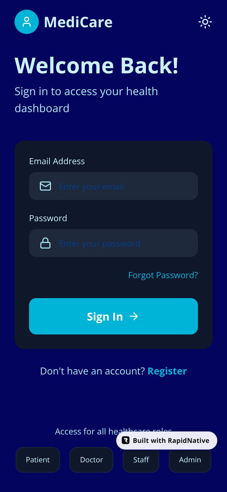 Browse this public project and clone it to start building your own React Native MediCare Clinic app.