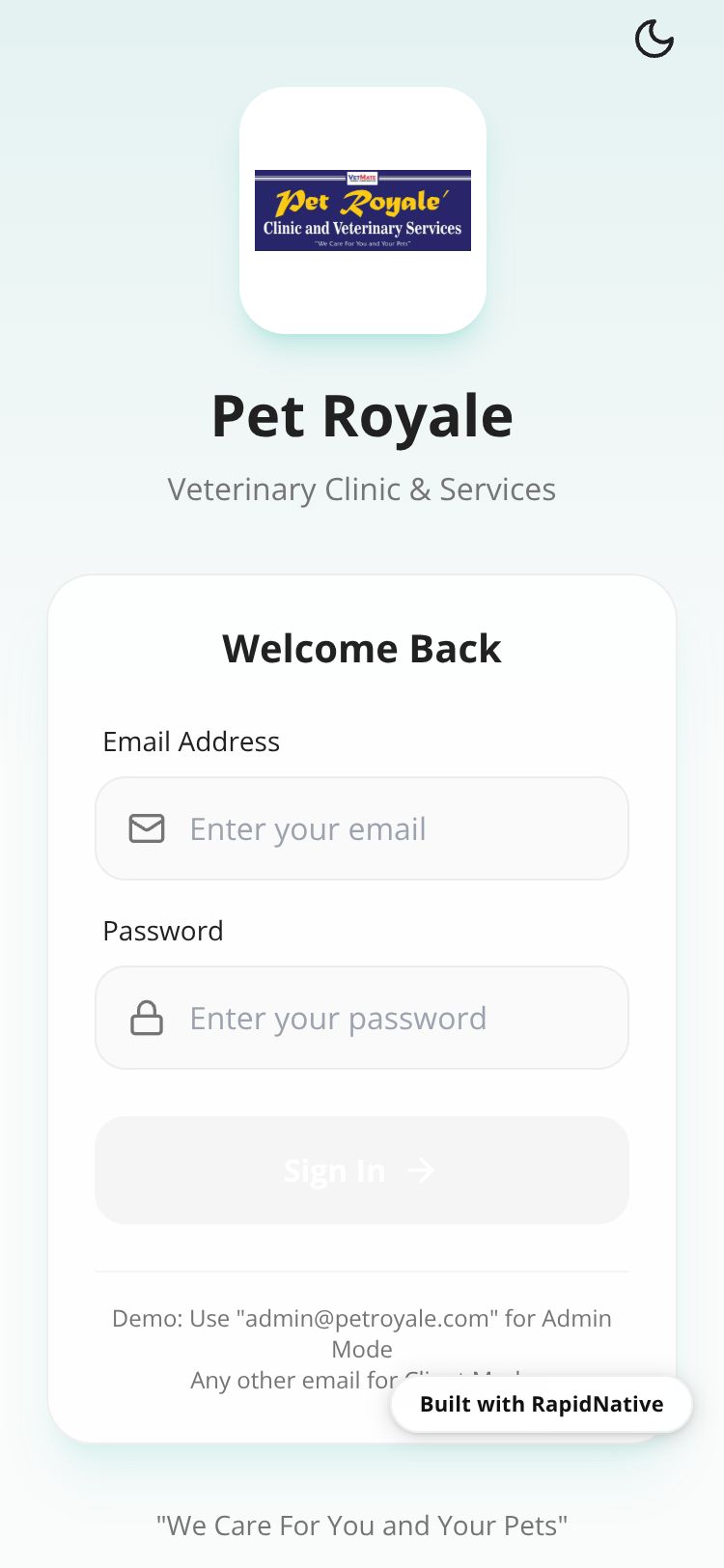 Browse this public project and clone it to start building your own React Native Pet Royale Vet Clinic app.