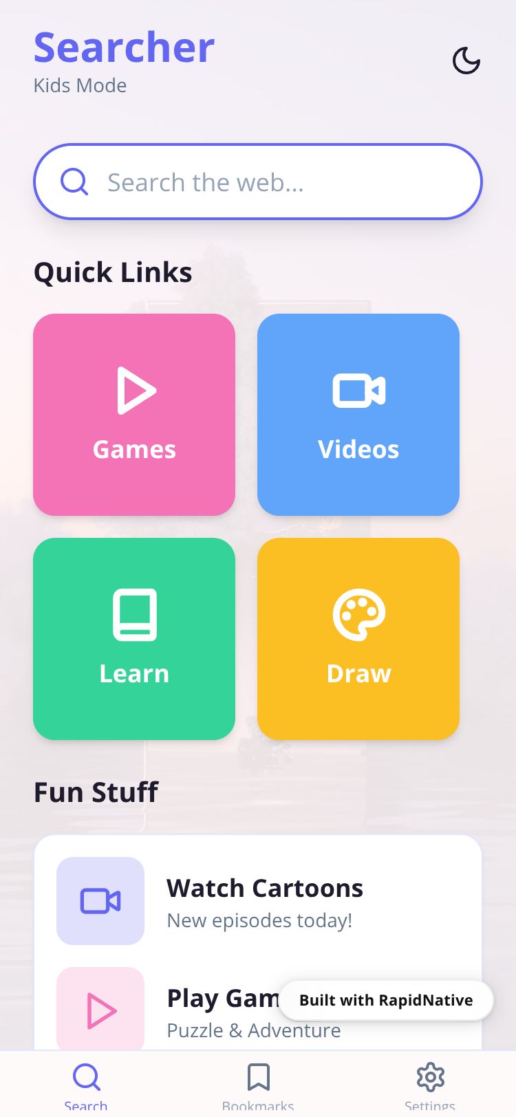 Browse this public project and clone it to start building your own React Native Searcher Kids app.