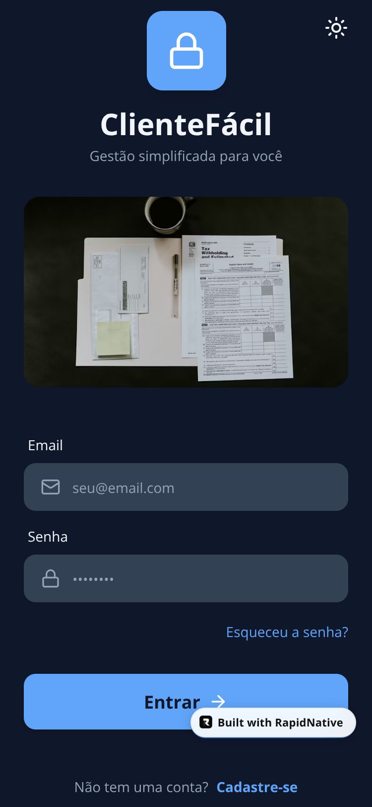 Aplicativo de CRM focado no cliente para gestão de contratos, pagamentos e suporte 24 horas.