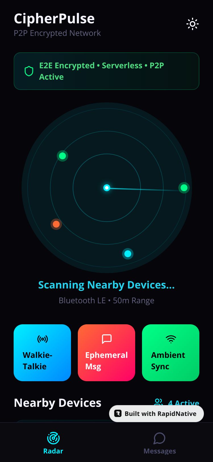 Revolutionary P2P encrypted communication app with ephemeral messages, Bluetooth radar walkie-talkie, and ambient sync. Serverless, end-to-end secure.