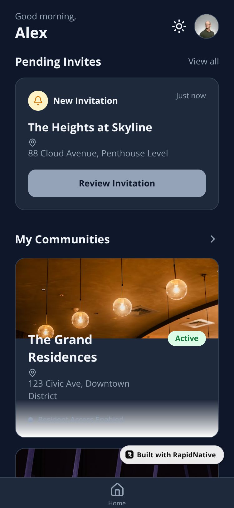 A premium residential community app designed for residents to manage access, services, and community connections with a calm, high-trust interface.