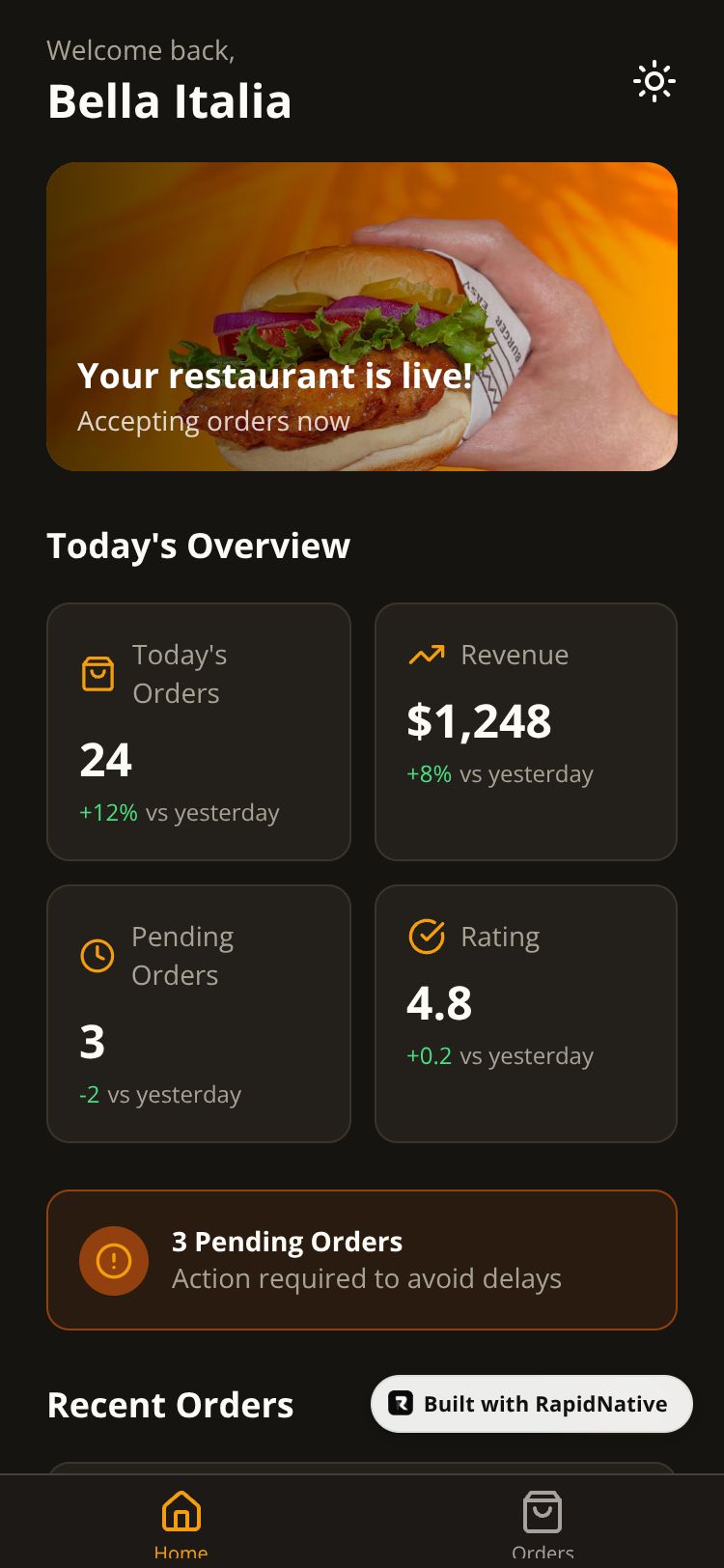A restaurant partner app for managing menus, orders, and analytics on the Cranau food delivery platform.