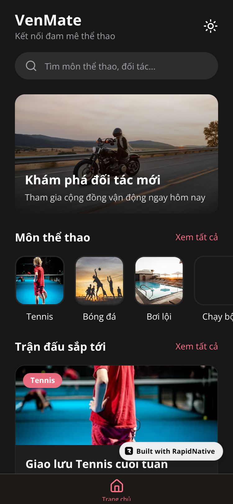 Ứng dụng kết nối người chơi thể thao, giúp bạn tìm đối tác, đặt lịch tập luyện và trò chuyện cùng cộng đồng đam mê vận động.