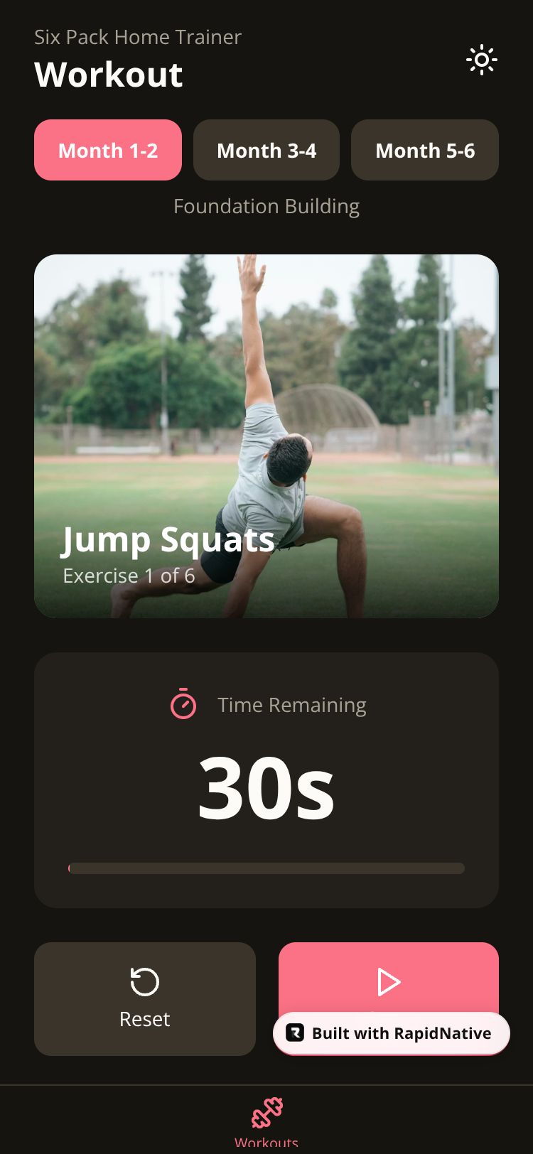 A 6-month home workout trainer app for fat loss, abs, and leg training without equipment. Features three progressive phases with timed exercises.