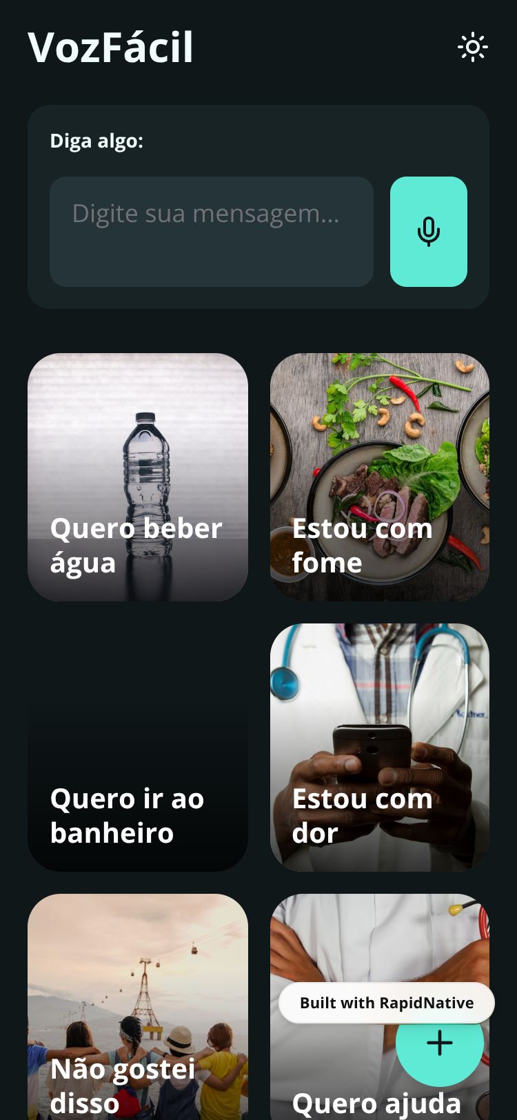 Aplicativo de comunicação alternativa para pessoas com TEA, permitindo expressão rápida através de botões de frases e texto-para-voz.