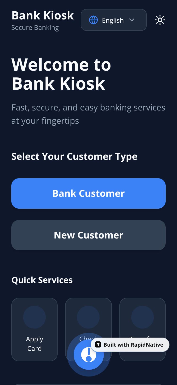 A touch-friendly banking kiosk application for public bank branches with large buttons, high contrast UI, and voice assistant integration.