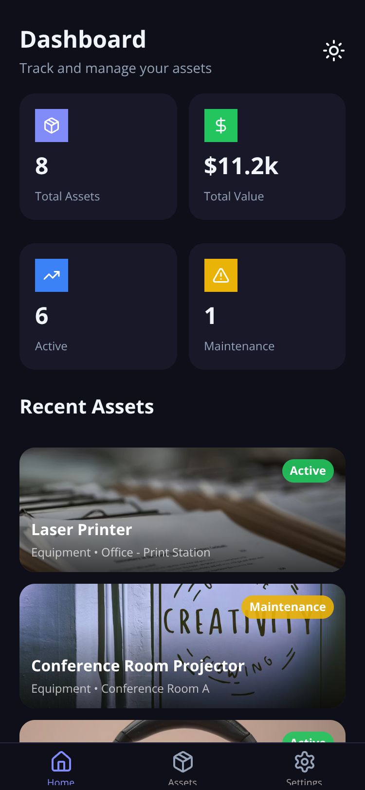 A professional asset management app for tracking equipment, inventory, and resources. Monitor asset status, locations, and value with ease.