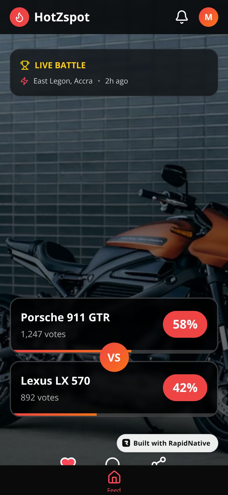 TikTok-style car battle community app with voting, mechanic guides, parts hub, and international leaderboards for car enthusiasts.