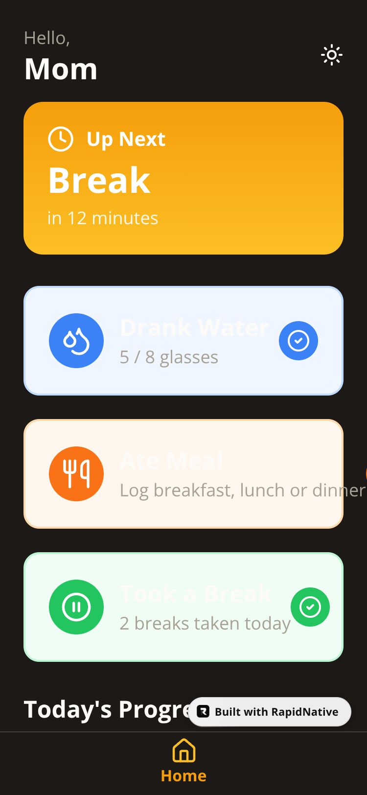 A gentle reminder app for daily wellness, helping mom track water, meals, and breaks with large, easy-to-use buttons.