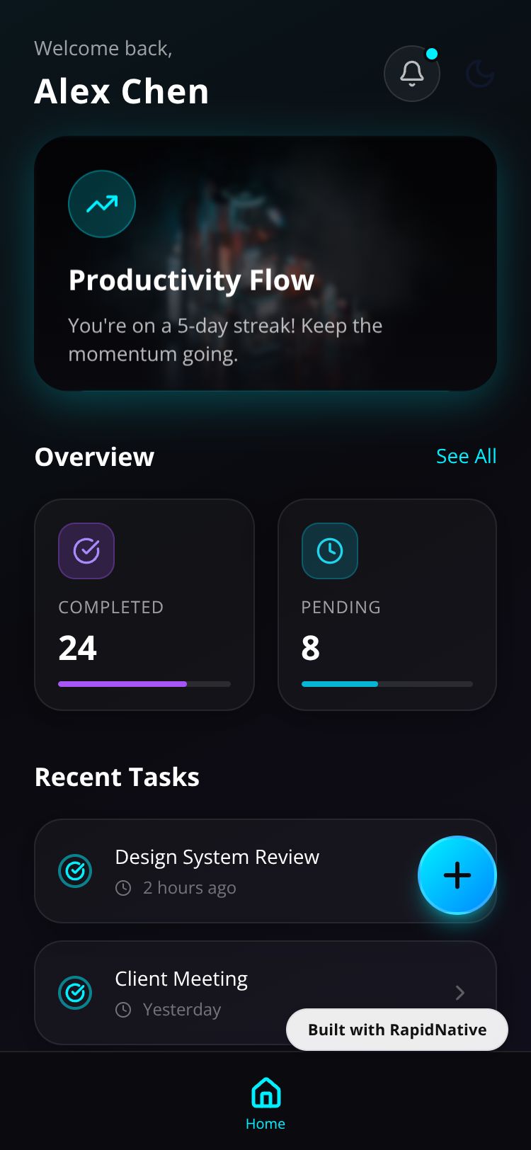 A futuristic task management app featuring anti-gravity UI, glassmorphism, and neon aesthetics.