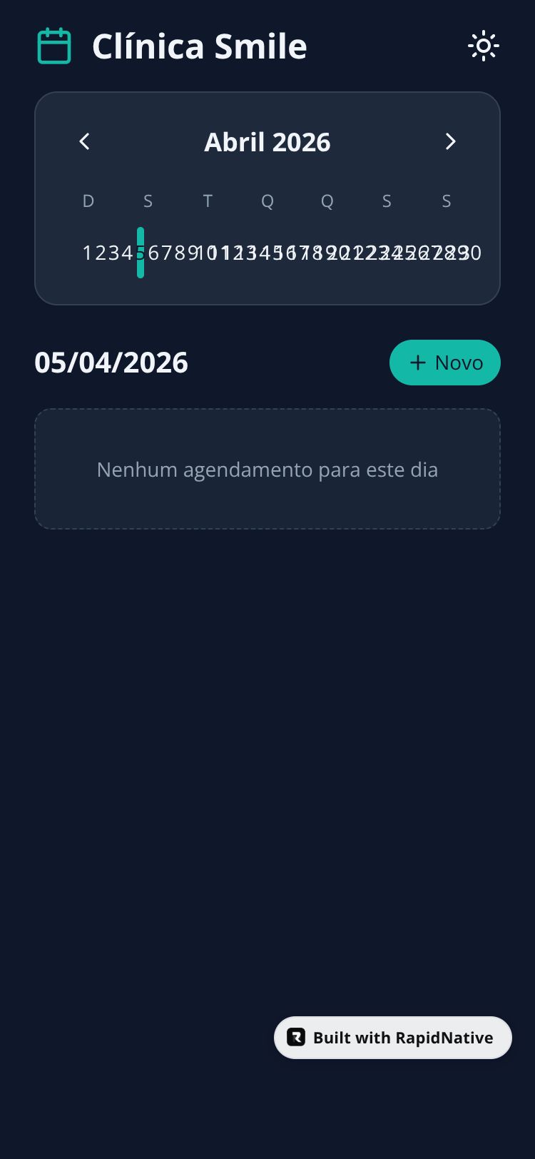 Gerenciamento de agendamentos para clínica odontológica com visualização de calendário e controle de status.