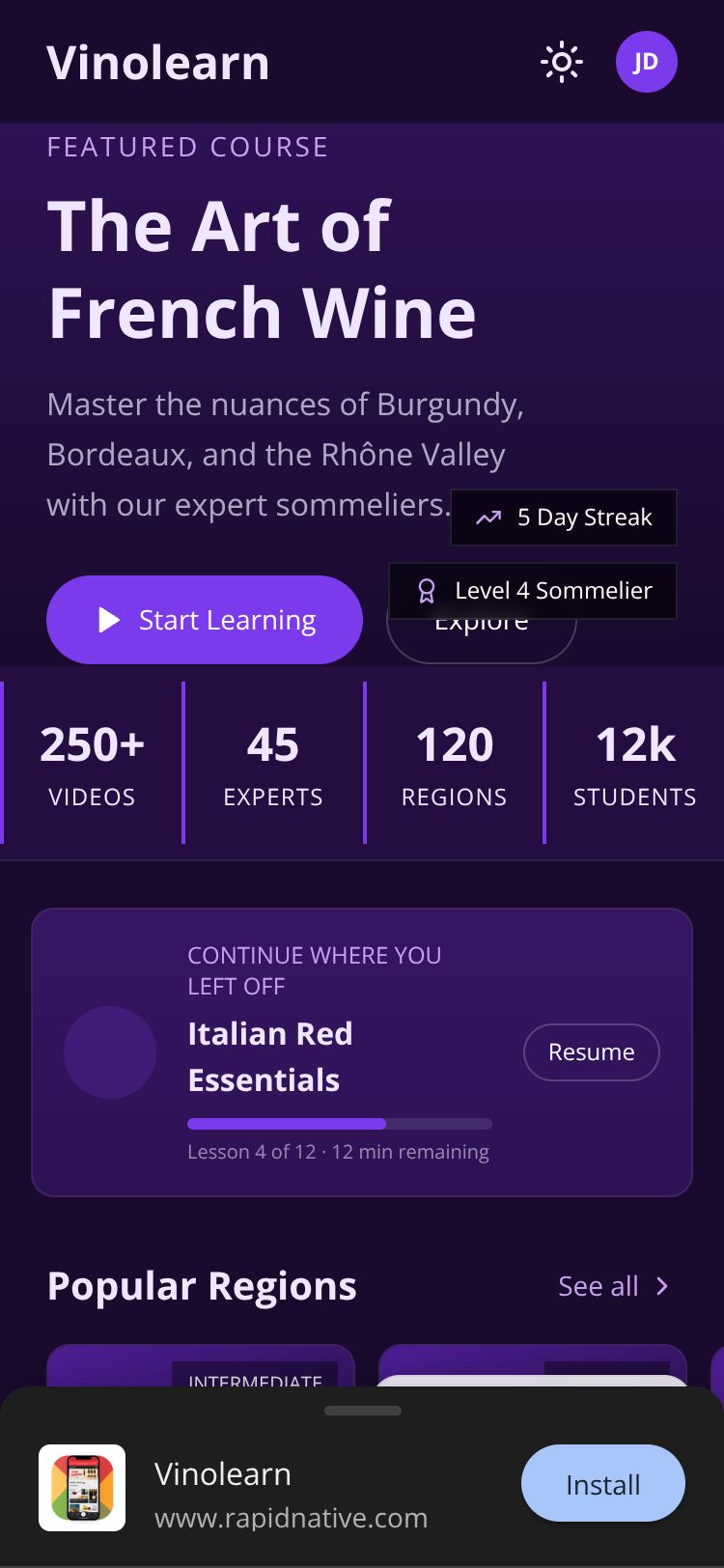 A native mobile wine learning app modeled after Cheflix, offering curated wine courses, region deep-dives, and expert-led tutorials in a streaming-style interface.