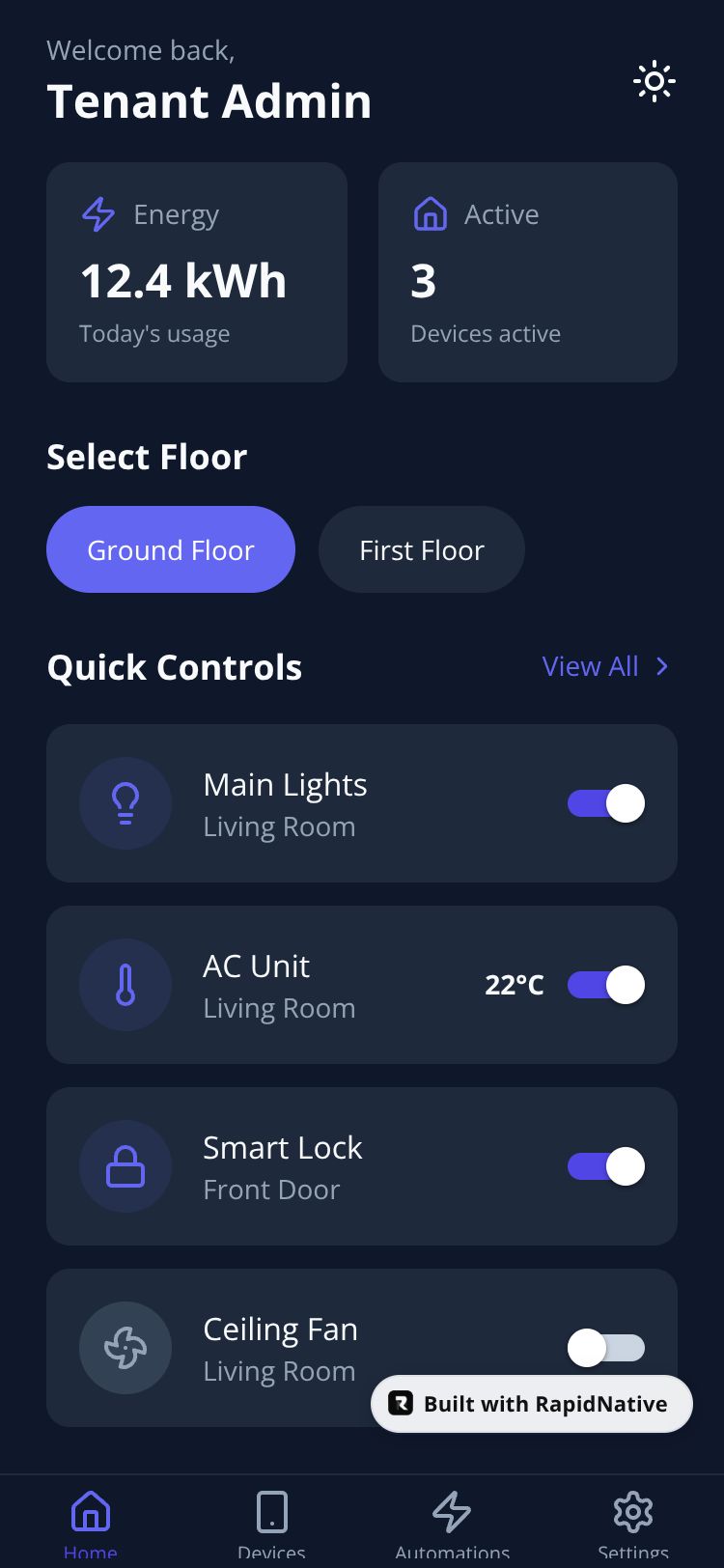 A modern, minimalist smart home control app for managing IoT devices across multiple properties with real-time status updates.