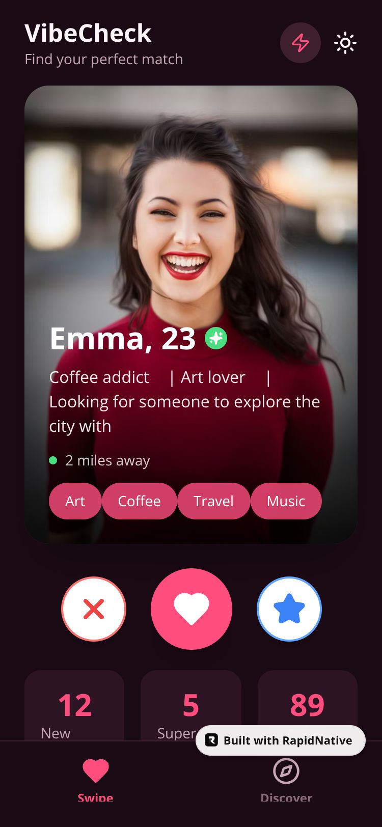 A modern Gen Z dating app with swipe cards, real-time matching, and vibrant social features. Connect with people who match your vibe.