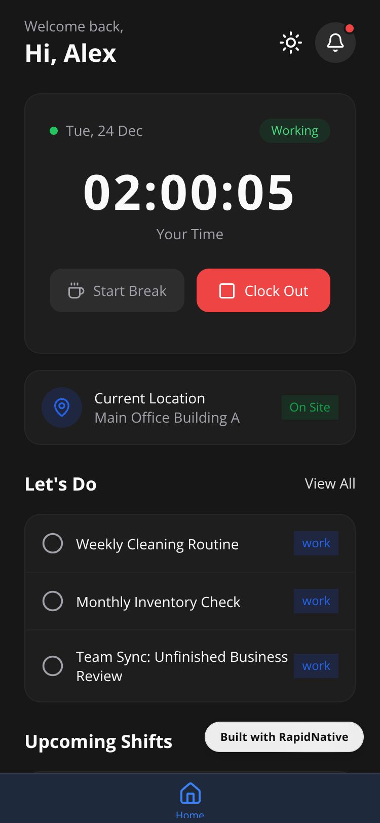 A professional time tracking and attendance app with clock in/out, break management, task lists, and shift scheduling for employees.
