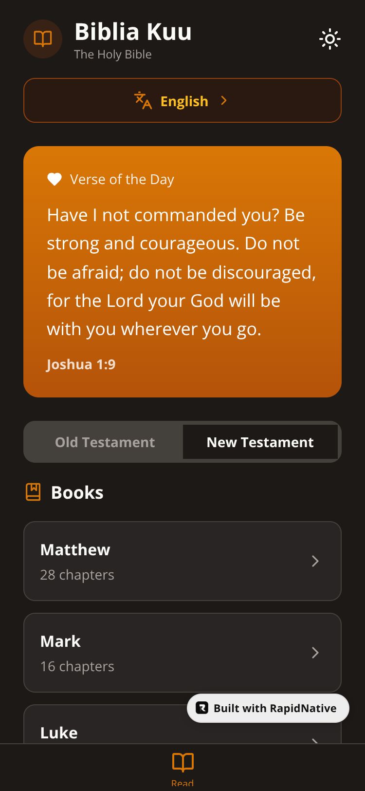 A beautifully decorated bilingual Bible app with English and Kiswahili translations, offline reading, bookmarks, search, and customization features.