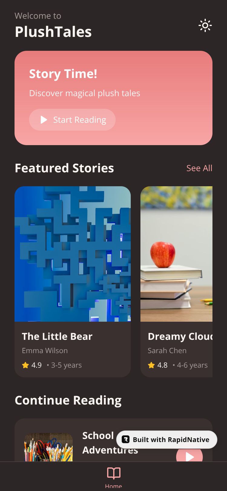 A cozy children's storybook app featuring soft plush-themed books with warm illustrations and gentle storytelling for young readers.
