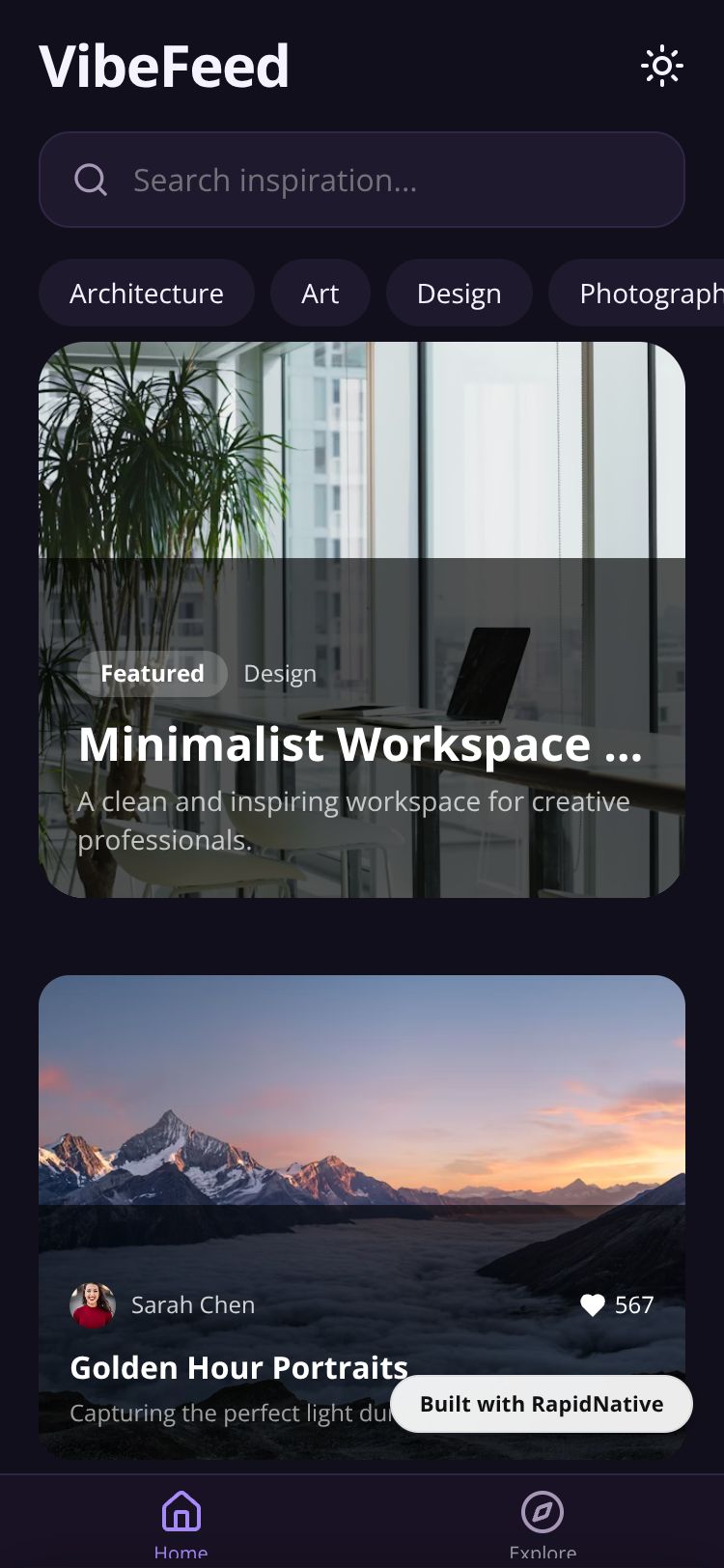 Browse this public project and clone it to start building your own React Native VibeFeed app.