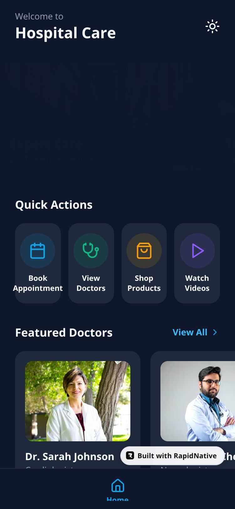 A comprehensive healthcare app connecting patients with doctors, featuring appointment booking, telemedicine, pharmacy store, and health education videos.
