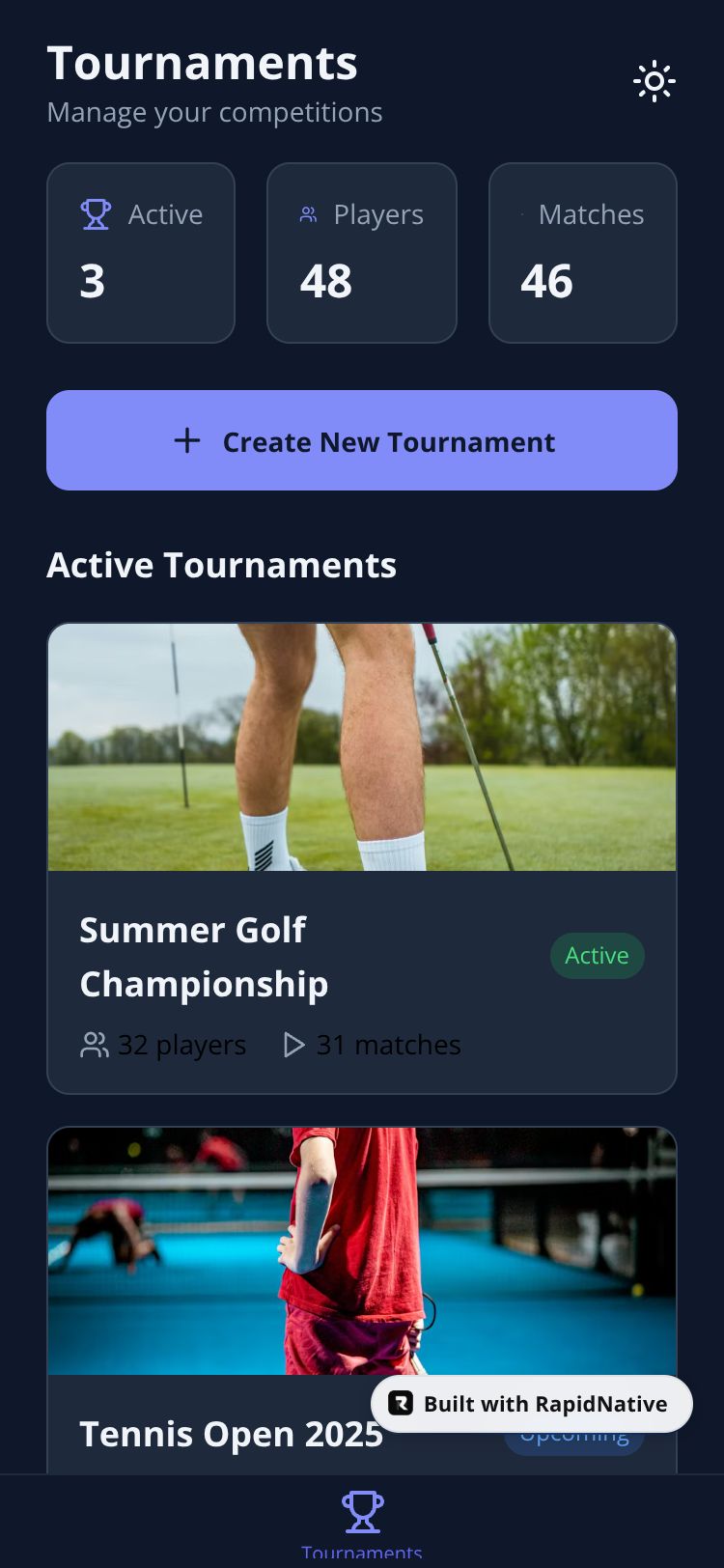 A comprehensive tournament management app for generating matches, tracking scores, managing players, and sending match notifications.