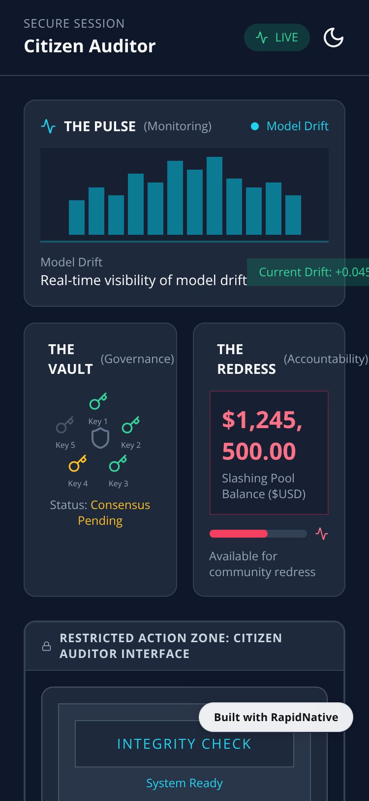 A high-security citizen auditor interface for blockchain governance with ZK-proof verification, sovereign veto capabilities, and real-time consensus tracking.