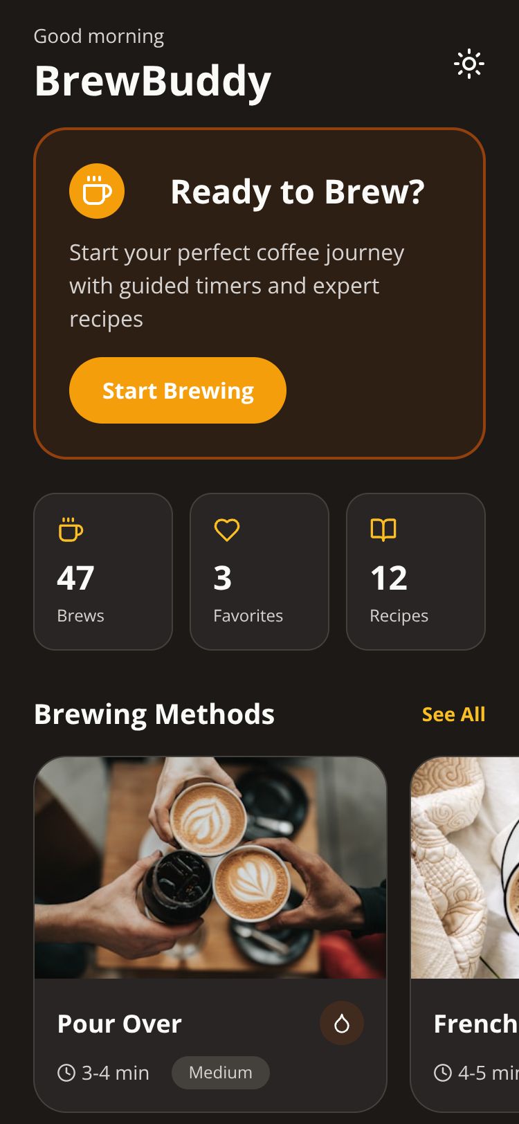 A delightful coffee brewing companion app with timers, recipes, and brewing guides. Track your perfect cup with adorable animations and step-by-step instructions for every brewing method.